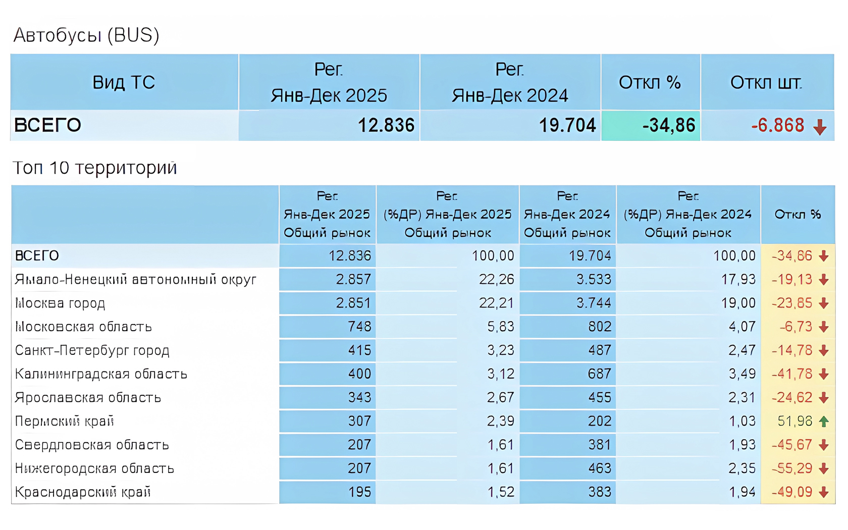 После удачного 2024 года (19,7 тыс. машин) рынок новых автобусов в 2025-м закономерно испытал глубокую рецессию, так как был отменён ряд дотационных федеральных программ и большая часть инвестицией в обновление автобусных парков переложена на плечи региональных властей, которые с этим не справились. Так общие регистрации в прошлом году упали почти на 35% до 12,8 тыс.