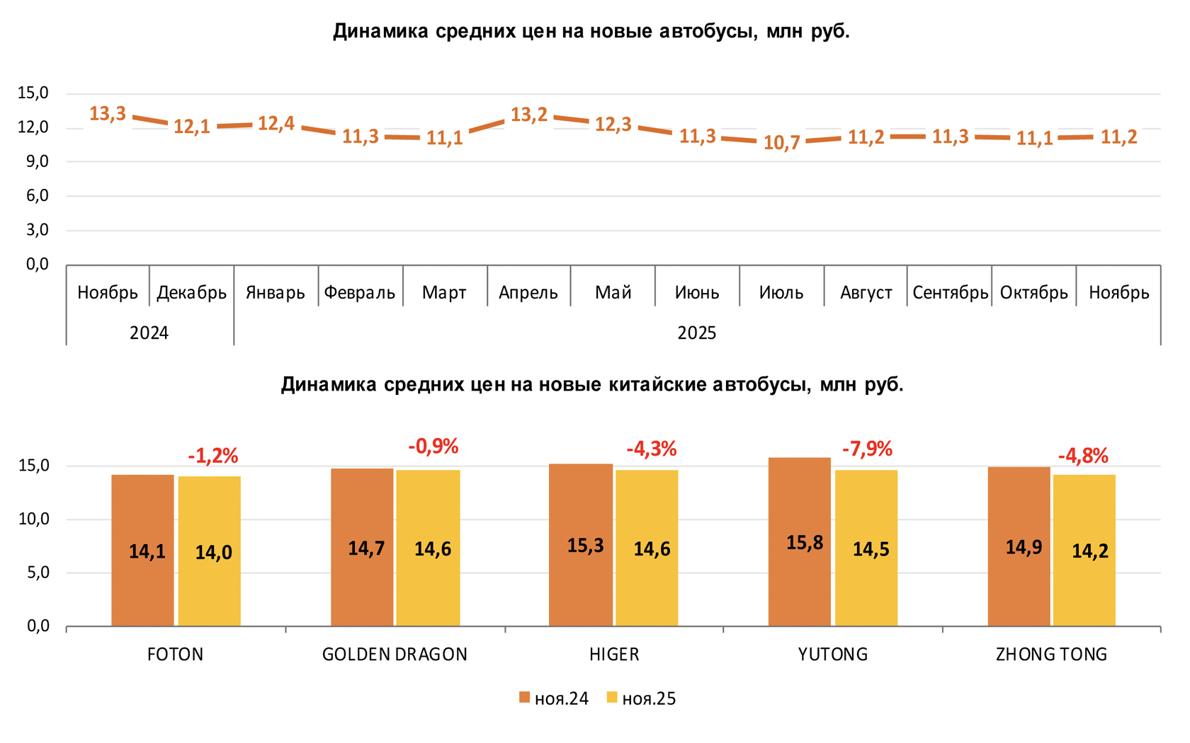 По данным маркетингового агентства НАПИ, средняя цена на новые автобусы* за год, с ноября 2024 по ноябрь 2025 года, снизилась в среднем на 2 млн рублей (-15,3%).