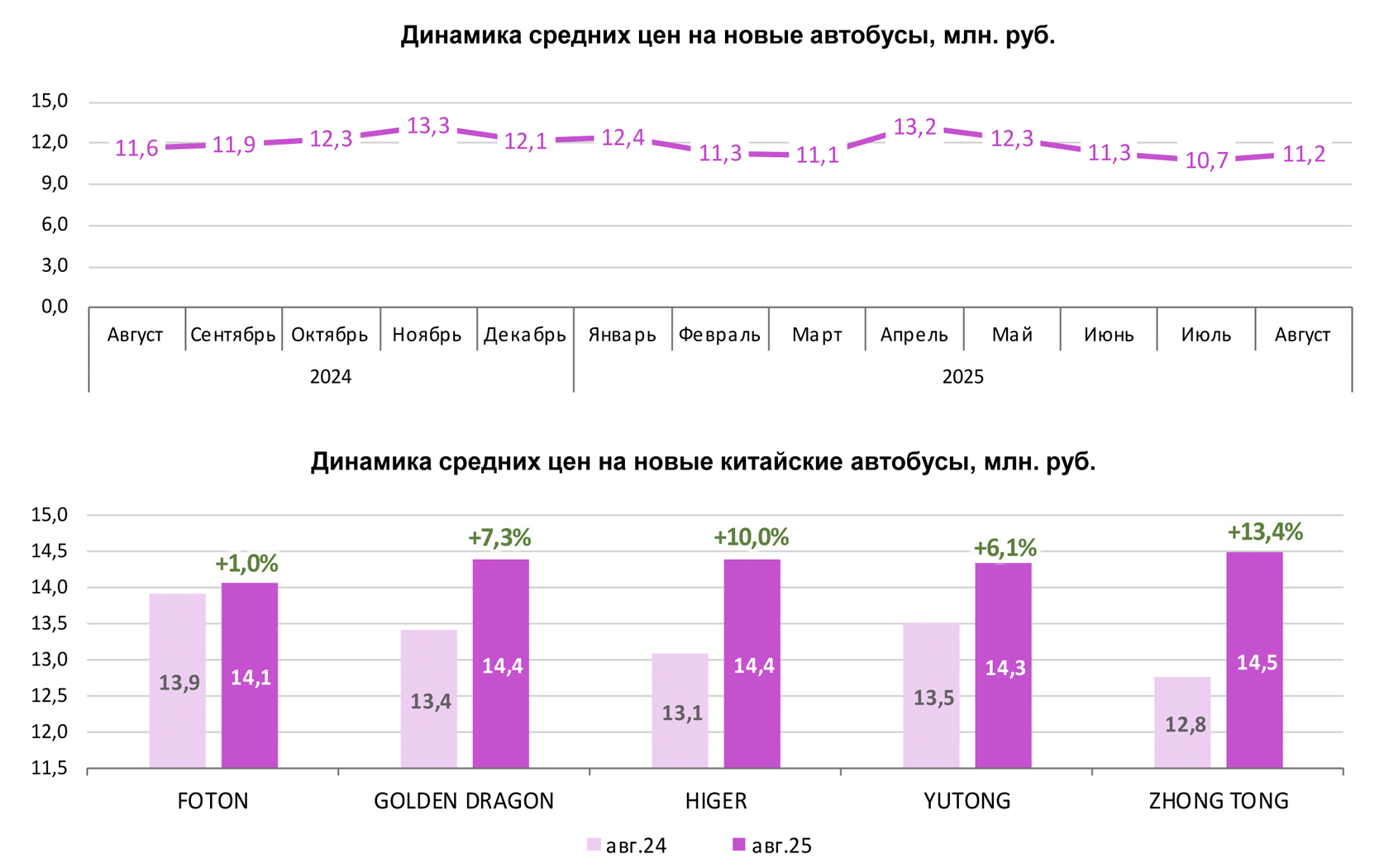По данным маркетингового агентства НАПИ, средняя цена на новые автобусы (кроме микроавтобусов) за год, с августа 2024 по август 2025 года, снизилась на 3,6% (с 11,6 млн руб. до 11,2 млн руб.).