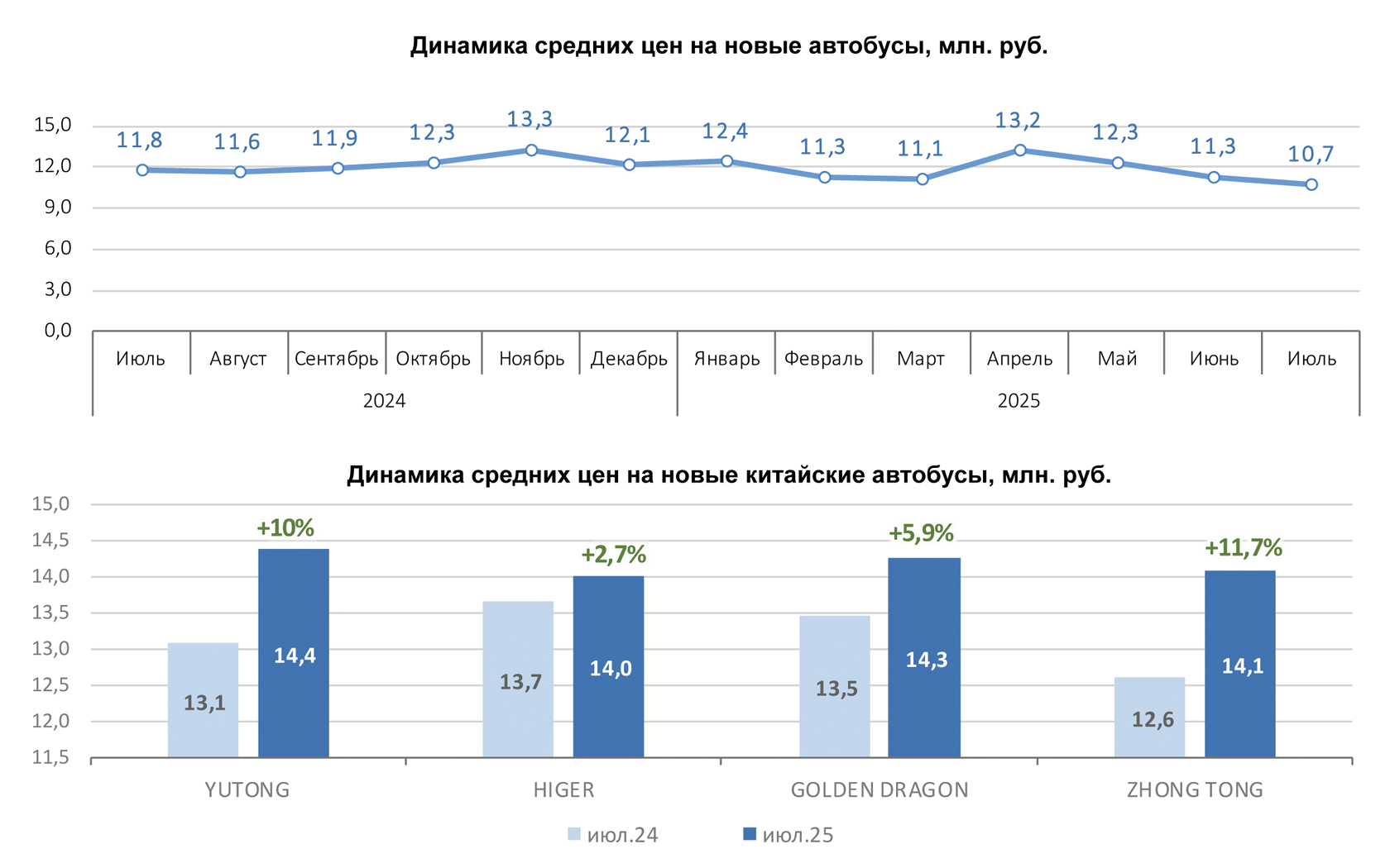 По данным маркетингового агентства НАПИ, средняя цена на новые автобусы* за год, с июля 2024 по июль 2025 года, снизилась на 8,8% (с 11,8 млн руб. до 10,7 млн руб.). За месяц, с июня по июль текущего года падение составило 5,1%.