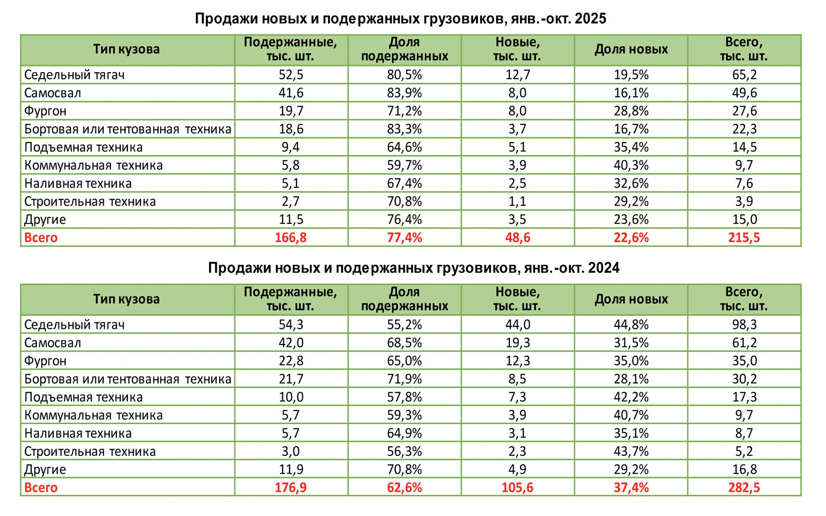 По данным маркетингового агентства НАПИ, за январь-октябрь 2025 года было продано 215,5 тыс. единиц новых и подержанных грузовых* автомобилей, что на 23,7% меньше, чем годом ранее, когда было реализовано 282,5 тыс. грузовиков. Так, продажи подержанной техники сократились на 5,7%, а новой упали на 53,9%.