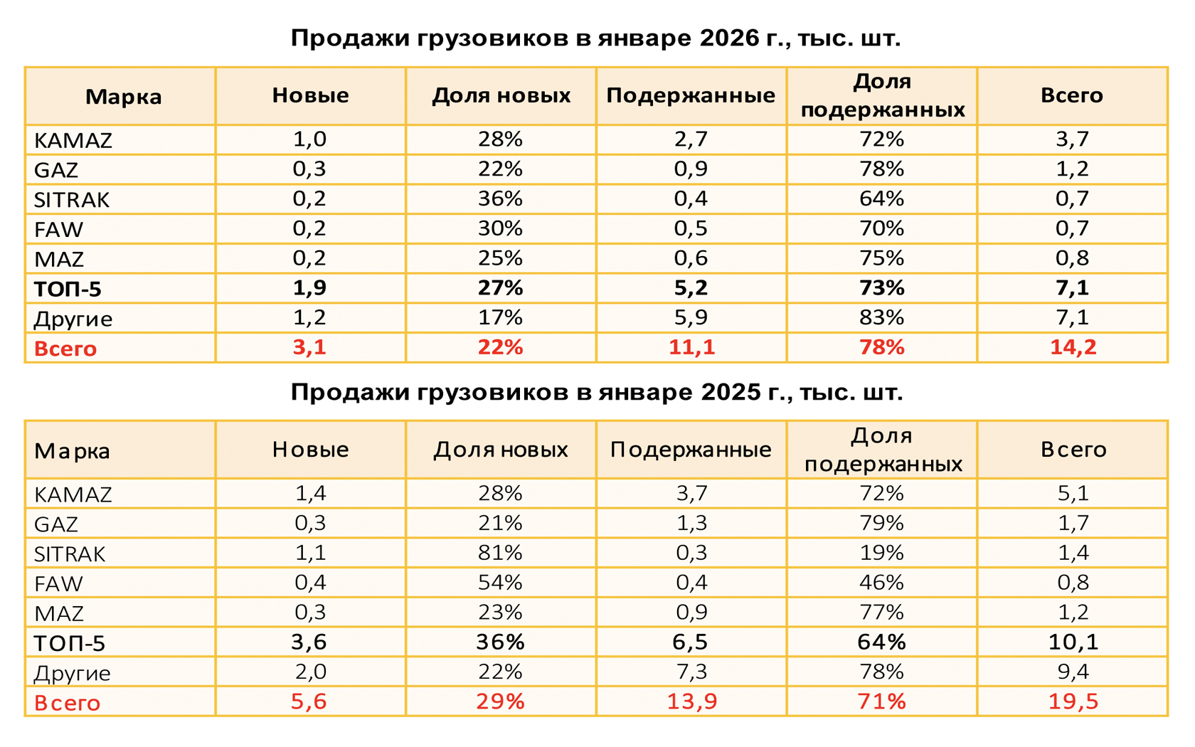 По данным маркетингового агентства НАПИ, в январе 2026 года было продано 14,2 тыс. новых и подержанных грузовых автомобилей полной массой более 6,0 тонн, что на 27,2% меньше, чем годом ранее.