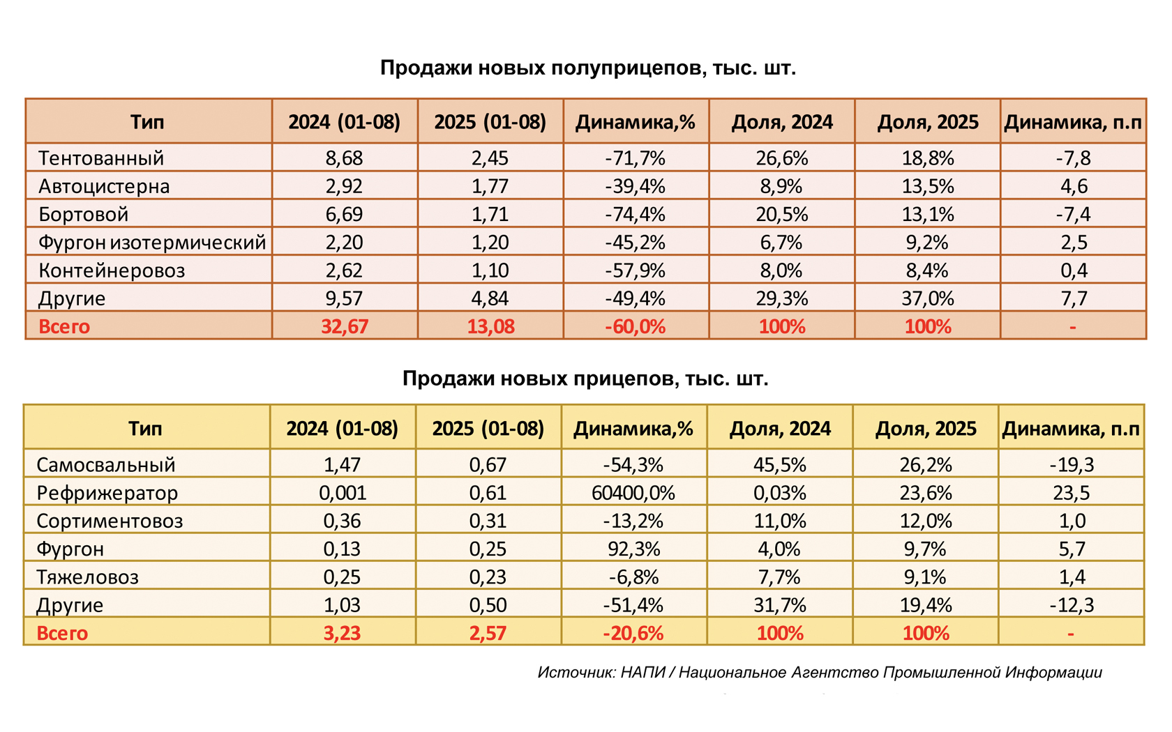 По данным маркетингового агентства НАПИ, в январе-августе 2025 года было продано 13,08 тыс. новых полуприцепов, что на 60% меньше, чем за аналогичный период 2024 года.