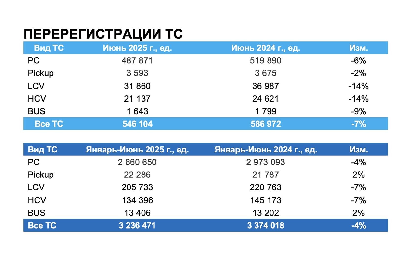 В июне 2025 года рынок автомобилей с пробегом в России продолжил демонстрировать отрицательную динамику: общее количество перерегистраций транспортных средств составило 546 104 единицы, что на 7% меньше, чем в июне 2024 года (586 972). На это указывают данные статистики «Автостат Инфо».