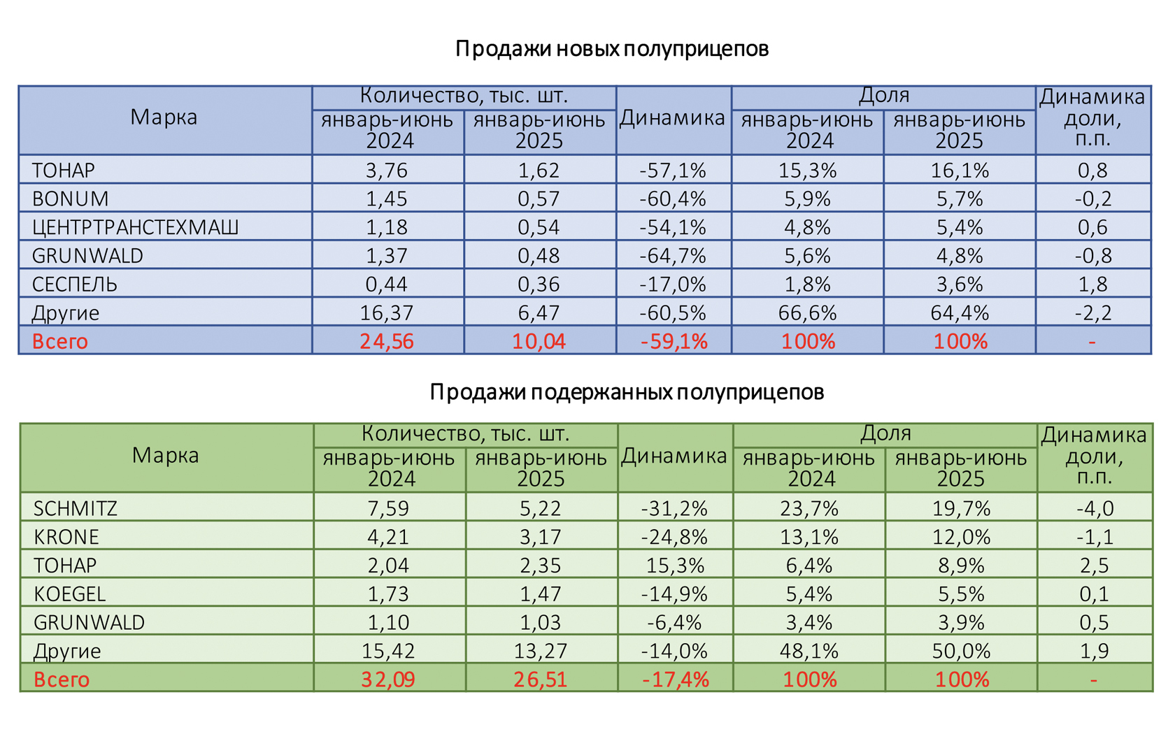 По данным маркетингового агентства НАПИ по итогам первого полугодия продажи подержанных полуприцепов сократились на 17,4%, продажи новой техники рухнули на 59,1%.