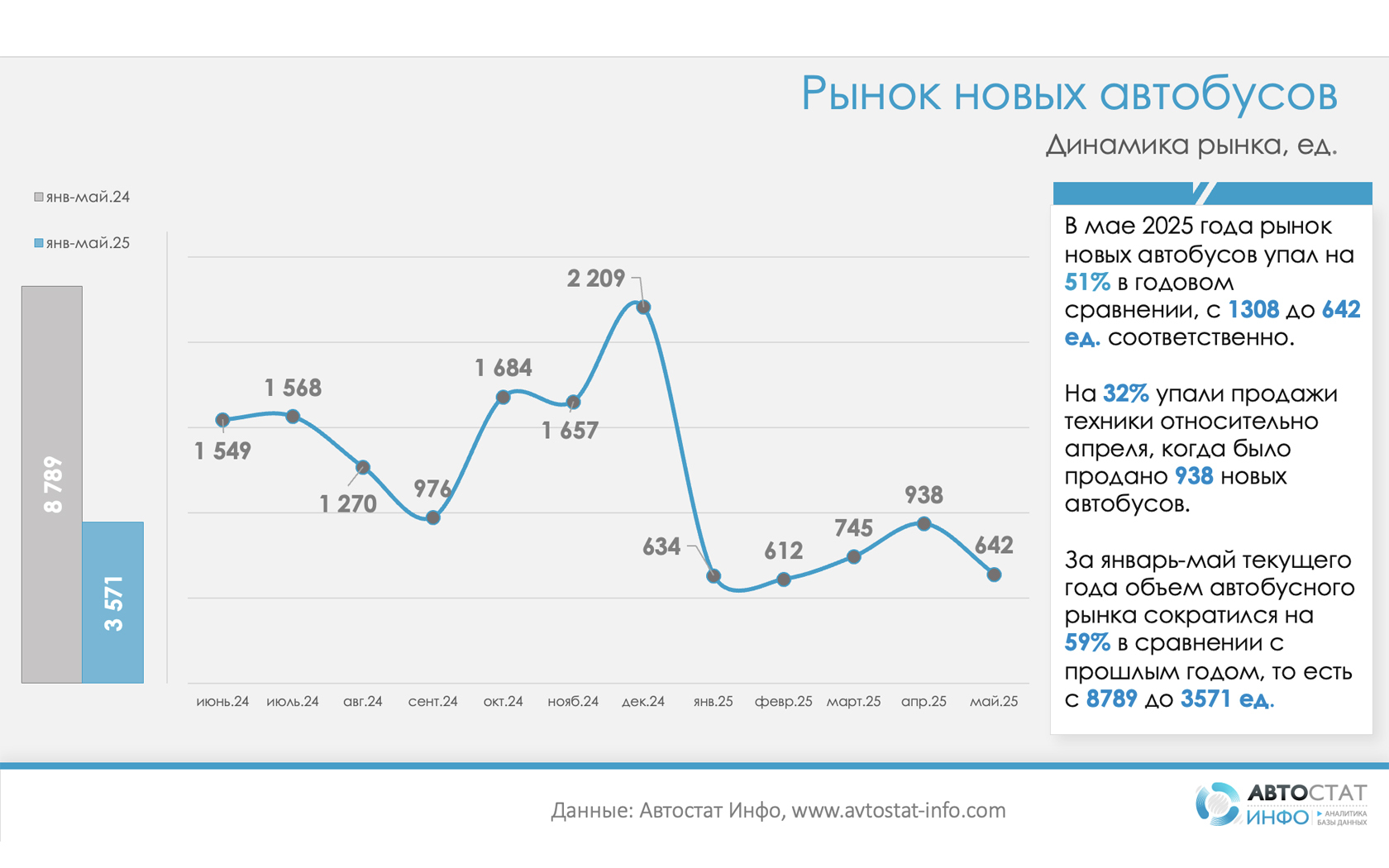 По данным «Автостат Инфо», в мае 2025 года рынок новых автобусов в России сократился на 32% по сравнению с апрелем — с 938 до 642 единиц. После кратковременного роста в марте и апреле сегмент вновь ушел в минус.